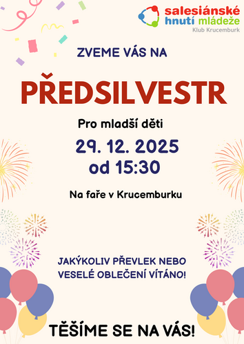 | 29. 12. 2025 | Předsilvestr pro mladší děti | Pokud más volno, určitě přijď! A vezmi si něco hezkého na sebe :) |